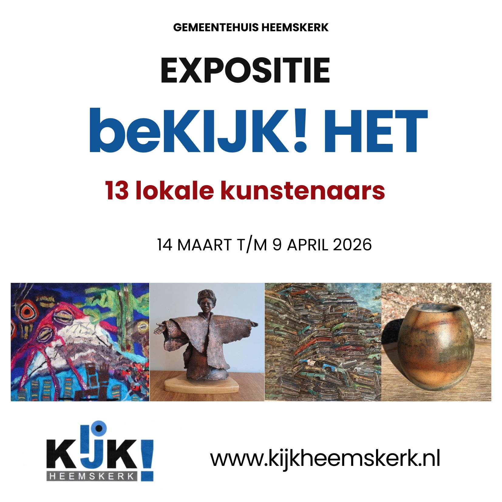 Van zaterdag 14 maart t/m donderdag 9 april 2026 presenteert Stichting KijkHeemskerk in het Gemeentehuis Heemskerk haar laatste tentoonstelling: 'beKIJK! Het'. Deze bijzondere expositie vormt het slotstuk van jarenlange inzet om kunst zichtbaar en toegankelijk te maken in Heemskerk. Helaas heeft de stichting moeten besluiten haar activiteiten te beëindigen door een tekort aan vrijwilligers. Met […]